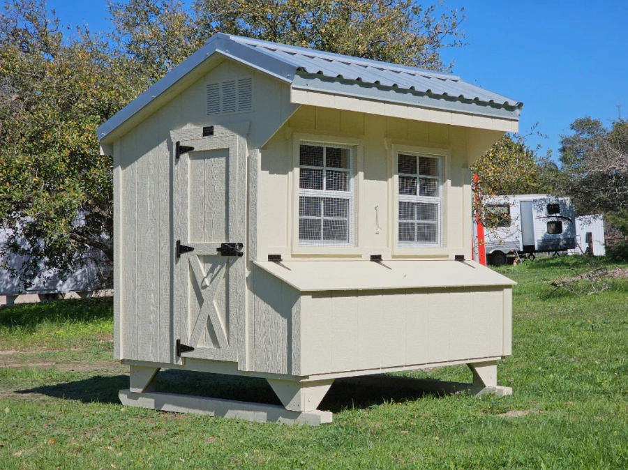 The Brahma Coop Almond is handcrafted for larger breeds and compact enough for any backyard. With its raised floor, ventilated design, and thoughtfully placed nesting boxes and roosting rod, this coop keeps your flock happy, healthy, and stress-free. The Galvalume metal roof and glassboard floor make maintenance simple, while the sturdy structure ensures your chickens stay safe from predators and Texas weather alike.